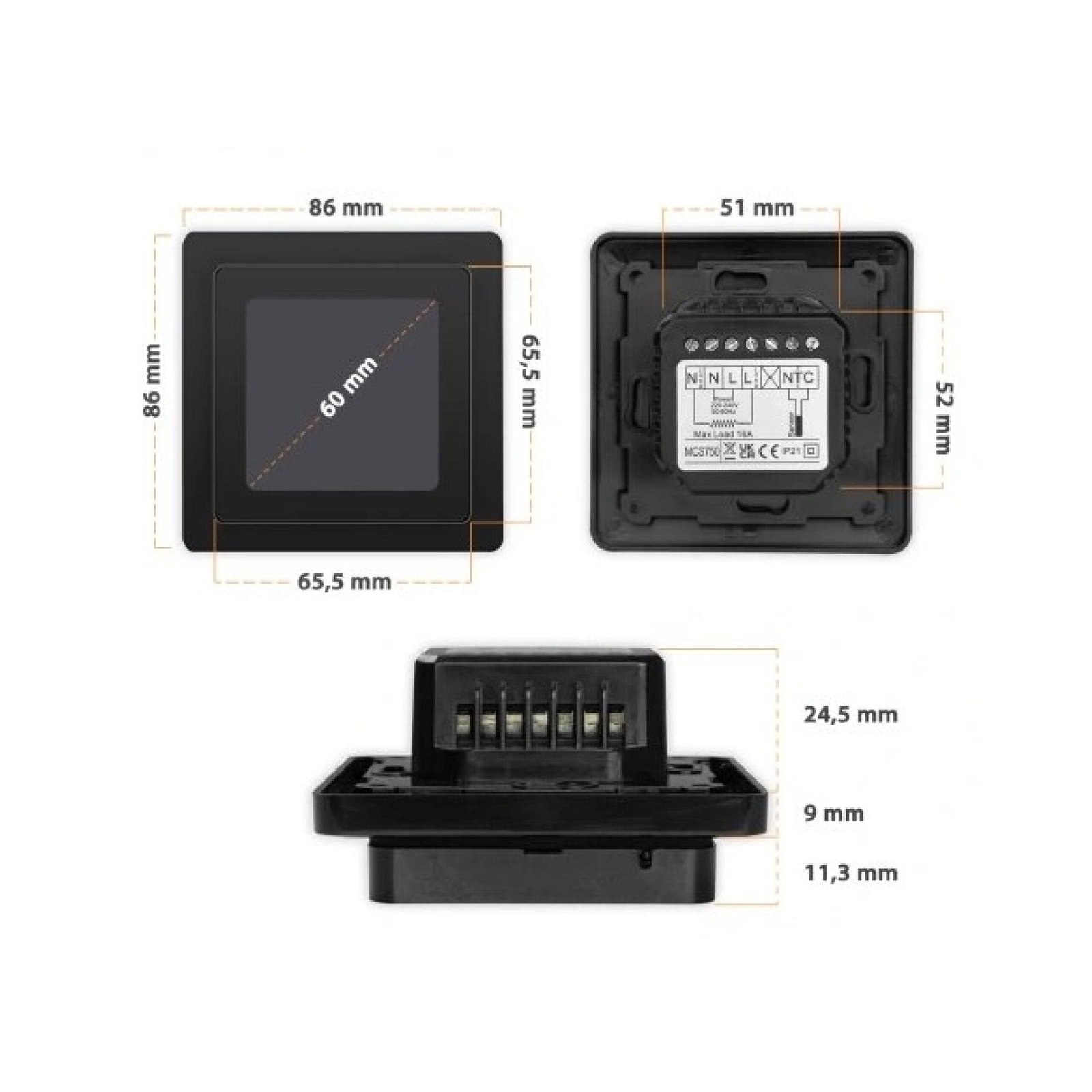 Afmeting LxBxD 86x86x12 mm